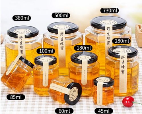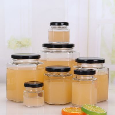 bottiglia economica all'ingrosso di vetro della salsa dell'inceppamento del poligono di esagono di vidrio di frosco con il coperchio su ordinazione dell'ansa